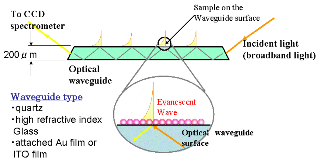 而對于SIS-5100,它是利用光波導光譜學來測量放置在專用光波導上的薄膜樣品的吸收光譜(無需任何厚度調整)。理論上,當白光從一邊入射到石英光波導(片)上,會反復反射并產生消逝波,通過檢測消逝波,可以實現高靈敏度的測量