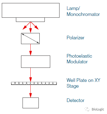 這項圓二色CD技術的突破是通過將一般圓二色CD光譜儀的光路配置進行轉換完成的。在傳統CD(臥式)中,光路的配置使得光束水平穿過裝滿溶液的比色池。通過將光路垂直配置,CD Microplate ReaderTM圓二色譜微孔板檢測儀/酶標儀可以直接測試孔板中的樣品溶液。通過XY運動臺進而可以移動孔板測試所有孔的樣品。