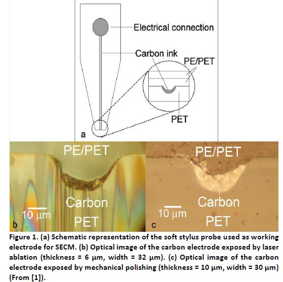 柔性微電極探針是由Salazar[1]等人發(fā)展起來的,用來實(shí)現(xiàn)粗糙、傾斜、較大的基體在接觸模式下的SECM。先在聚乙烯對(duì)苯二酸酯薄膜中燒蝕一個(gè)微通道,然后用導(dǎo)電的碳墨填充。用聚合物膜固化碳軌道和疊片之后,切出V型針,從而形成探針。通過UV光切割或者刀片切割,露出碳軌道尖端的橫截面,拋光產(chǎn)生一個(gè)新月形的碳微電極[1]。