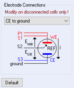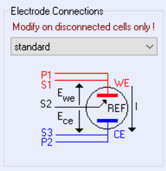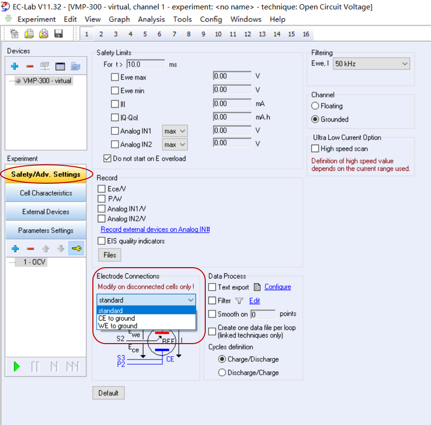 EC-Lab軟件中,添加實驗后,在左側Safety/Adv. Settings下有一個Electrode Connections部分,其中可以選擇standard、CE to ground、WE to ground或者其他大電流儀器的連接方式(如下圖)。
