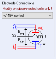 如果VMP300系列電化學工作站已經連接了某個大電流儀器,那么Electrode Connections下面會出現相應的特殊的電極連接方式。比如,電化學工作站連接了1A/48V大電流器,那么Electrode Connections下面會出現“+/-48V control”的選項,如下圖: