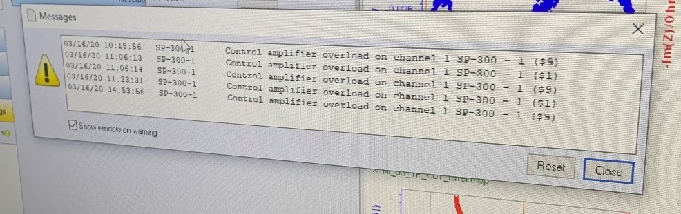 EC-Lab軟件檢測到Ewe、Eoc或者I過載時,都會彈出報錯信息。下圖就是一個提示過載的信息。本文主要介紹過載的兩種情況。