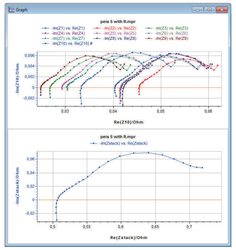 下圖例子展示了電池模組的EIS交流阻抗測(cè)試結(jié)果。實(shí)驗(yàn)方法為PEIS。在這個(gè)實(shí)驗(yàn)中,主通道控制10個(gè)元件組成的模組的電位,并測(cè)量流過(guò)整個(gè)模組的電流。整個(gè)模組的交流阻抗譜圖顯示于底部的曲線圖,各個(gè)原件的交流阻抗譜圖則疊加顯示于頂部的曲線圖。在這個(gè)實(shí)驗(yàn)中僅需要6個(gè)測(cè)試通道:1個(gè)作為主通道,其余5個(gè)作為從通道。