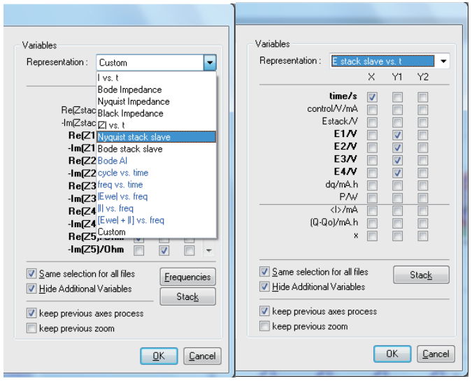 STACK模組實(shí)驗(yàn)可以通過(guò)下圖“Slave”選項(xiàng)令從通道數(shù)據(jù)點(diǎn)全部疊加顯示于同一個(gè)曲線圖。對(duì)于EIS交流阻抗譜測(cè)試,整個(gè)模組及各個(gè)元件的Nyquist及Bode圖均可以顯示。