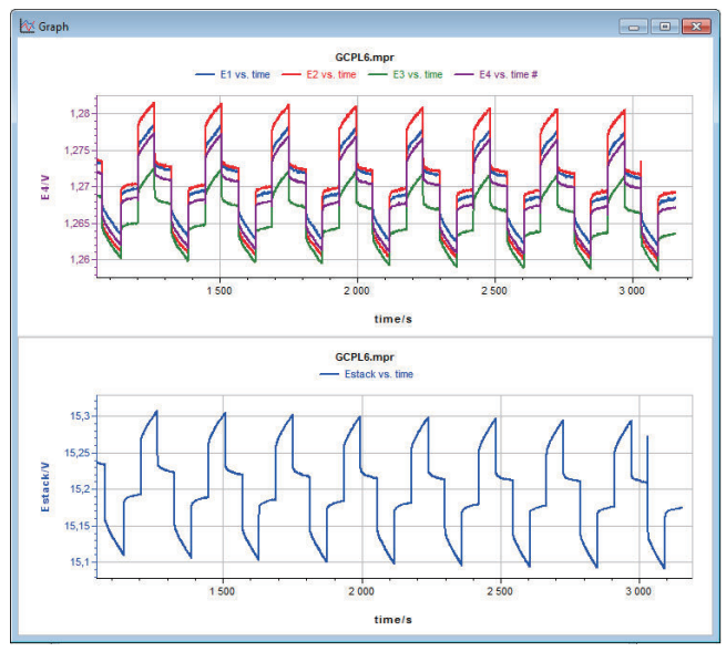 下圖例子展示了4元件串聯(lián)電池模組的GCPL恒流充放電實(shí)驗(yàn)結(jié)果。