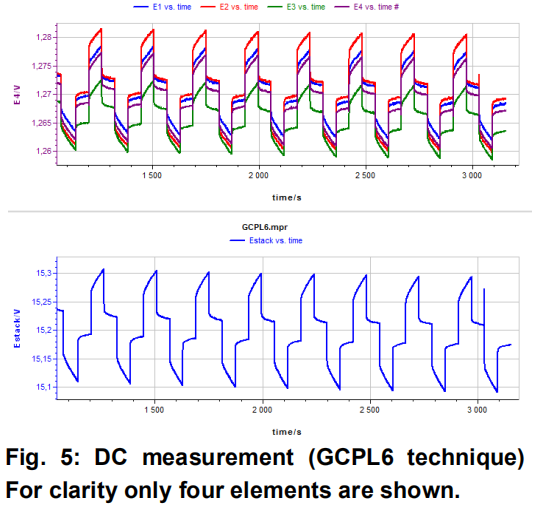 關于直流測量,下圖Fig.5為GCPL6測試方法的結果。各元件的電位曲線顯示于上面曲線,整個模組的電位曲線顯示于下面曲線。