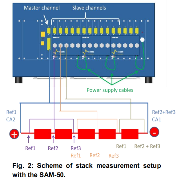 每個連接至SAM-50的通道均可測量兩個模組元件的電位(ΔE1=Ref1-Ref2,ΔE2=Ref2-Ref3)(ΔE1為元件1電位,ΔE2為元件2電位)。所以,16通道的多通道電化學工作站(1個主通道,15個從通道)連接3個SAM-50,即可測量30個元件組成的模組。