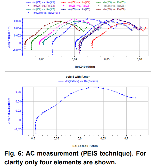 如PEIS實驗,顯示方式與直流測量類似。各元件的交流阻抗譜圖顯示于上面曲線,整個模組的交流阻抗譜圖顯示于下面曲線(Fig.6)。