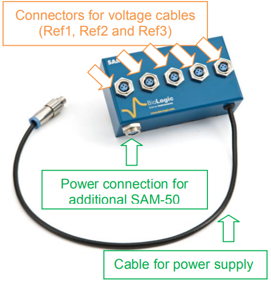 此附件兼容電化學工作站VMP3及MPG-2系列儀器。每個SAM-50最多可連接5個標準通道(有或無EIS功能均可)。