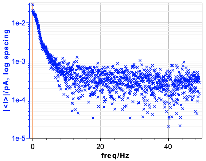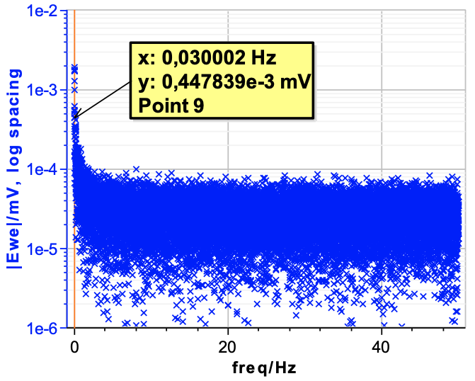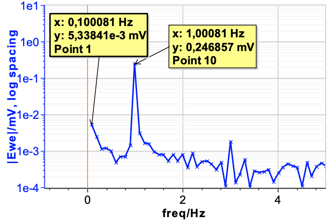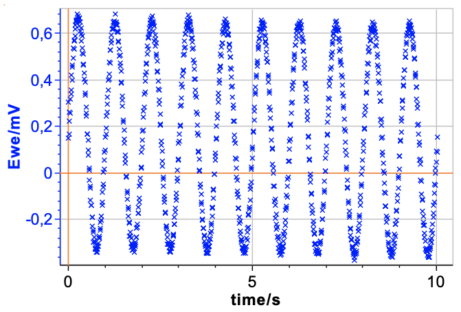 本文使用VSP-300電化學工作站。對于程序1,使用超低電流(ULC)選項。電流范圍為1pA,用ZRA技術記錄ECN,用OCV快速技術記錄EPN。對于程序2,不使用ULC選項,電流范圍為1μA。使用CASP技術生成0.5 V振幅(或1 V峰對峰)的1 Hz正弦波。用ZRA技術記錄產生的電位。對于這兩種程序,均使用最小的電位控制范圍,允許1μV的控制分辨率。在測量的電流和電位上應用低通1 kHz模擬濾波器。此模擬濾波器可以在“Advanced Settings”選項卡中選擇。采樣率為100Hz(即每0.01秒一個點)。測量持續時間為300s,這意味著可以觀察到的最低頻率為1/(300)≈3.3mHz(見附錄)。