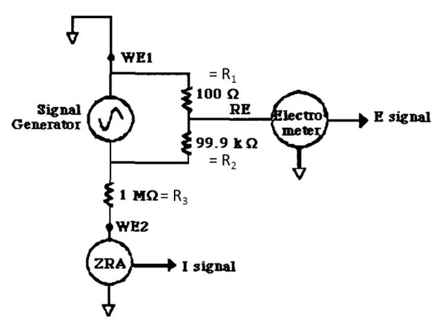 EC-Lab采用ZRA技術進行噪聲測量。在這項技術中,恒電位儀在對電極(CE)和工作電極(WE)之間保持0 V的電位差,并測量CE和WE之間產生的電流,也測量CE/WE體系與參比電極之間的電位差。