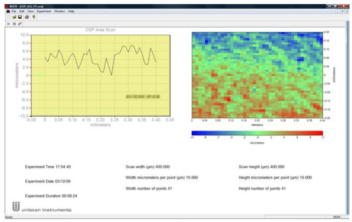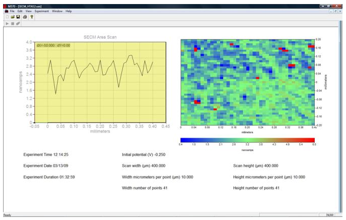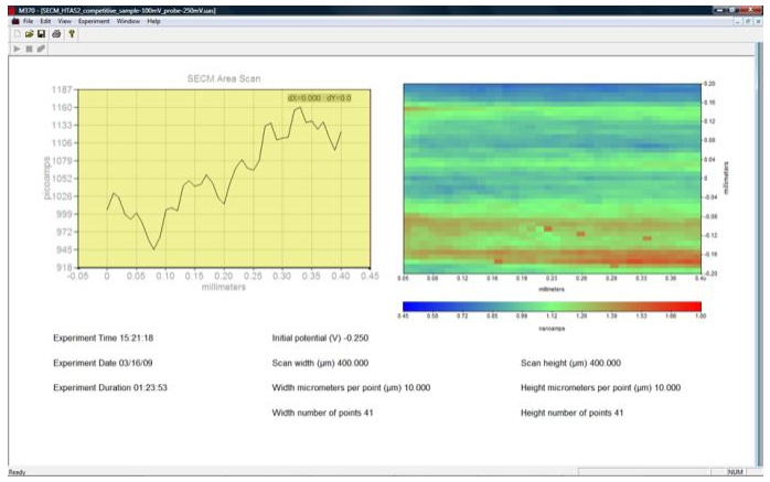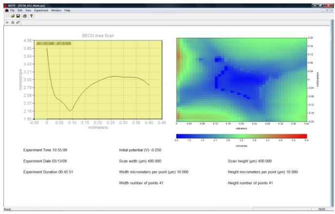 在兩個(gè)絲網(wǎng)印刷電極樣品上演示了不受形貌影響的SECM測試新方法。M470(或M370)的這個(gè)特征允許用戶測試那些用標(biāo)準(zhǔn)恒高SECM技術(shù)無法測量的樣品。
