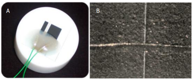 圖1 (A)鑲嵌在PTFE中的絲網(wǎng)印刷傳感器;(B)十字校準(zhǔn)標(biāo)志(放大200倍)
